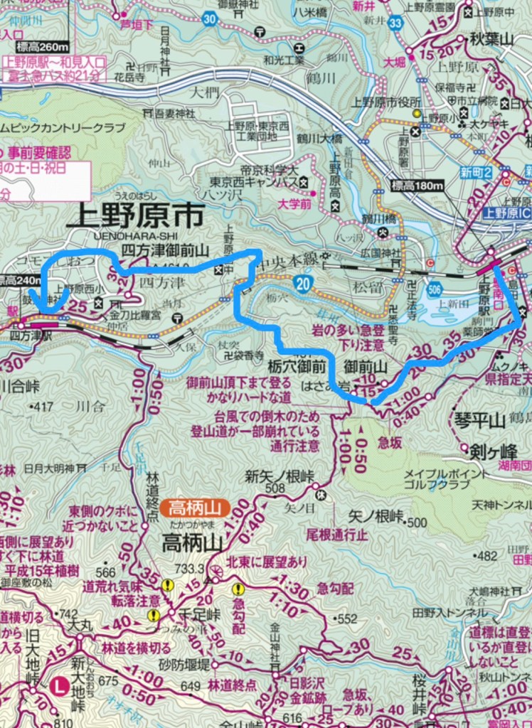 上野原駅8:30〜登山口〜鶴島御前〜栃穴御前〜マツキヨ〜四方津御前〜西御前〜四方津御前(14:30頃解散予定)